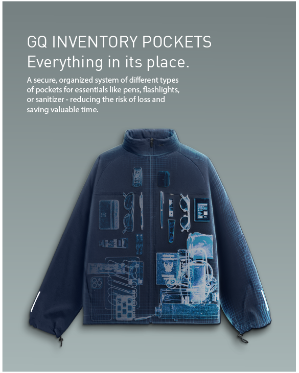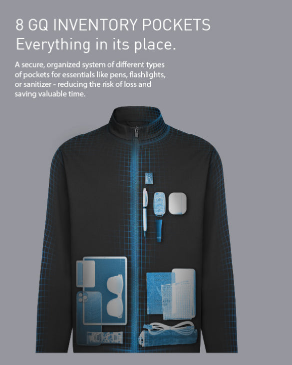 A secure, organized system of different types of pockets for essentials like pens, flashlights, or sanitizer - reducing the risk of loss and saving valuable time.
